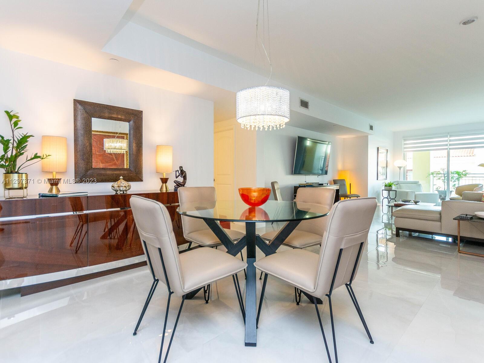 Very beautiful, elegant, spacious & unique furnished unit. First time on the market for rent. Only 3 units like this in Toscano, and the only one w/a terrace on the Pool deck. Split plan 3 bedrooms, 3 bathrooms, powder room and den, that has been used as formal dinning room. Marble floor throughout, new AC, Water heater, appliances, lighting, fixtures, painting, baseboards.