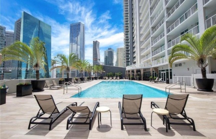This beautiful unit is located in the Vue at Brickell building. It features tile flooring in the kitchen and recently installed vinyl floors that resemble tile throughout the rest of the unit. A washer and dryer are included. The unit comes with one assigned parking space. Amenities include a beautiful pool area, fitness room, and 24-hour concierge and valet services.