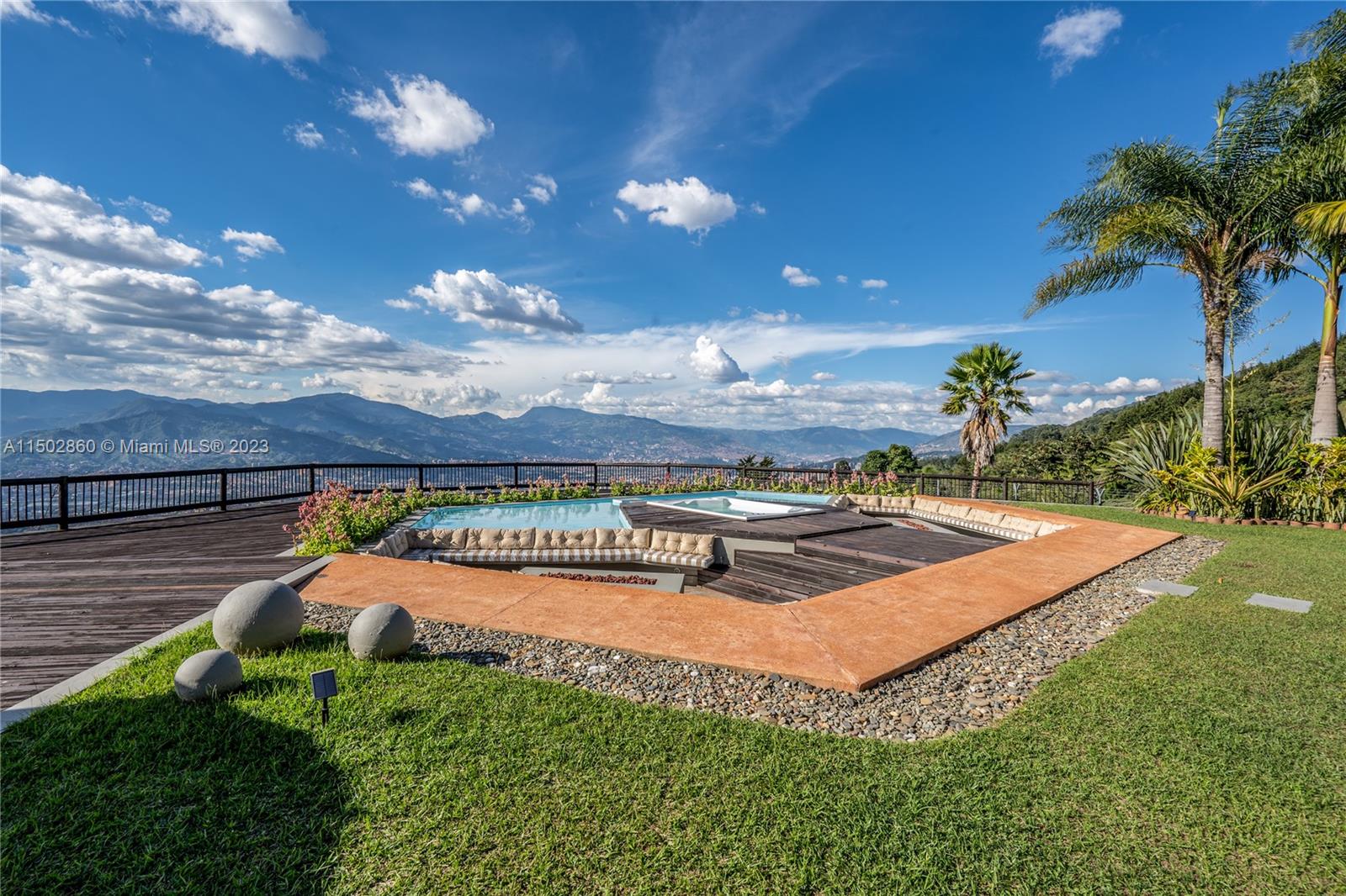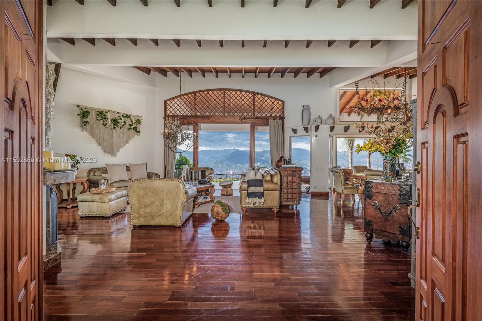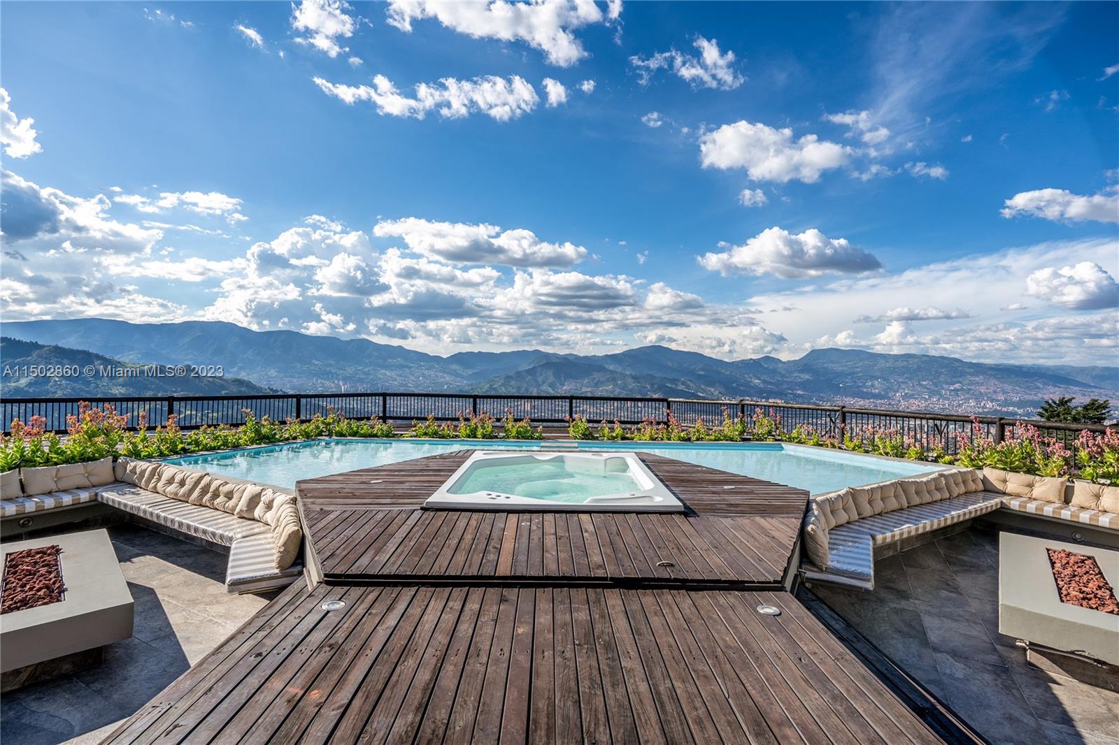 “Spectacular property in Envigado, Antioquia (Medellín, Colombia), offers a life of luxury, 24-hour security, and panoramic views of the city. Spacious land (approximately 1.7 acres) with 11,087 square feet of living space, built in 2001. Main house: 6 bedrooms, 8 bathrooms, master suite on the first floor with 2 bathrooms; all bedrooms have their own bathroom and closet. Guest house with private bedroom and bathroom. This property includes 4 stables with bathrooms, 2 kitchens, kitchen with island, tennis court, heated jacuzzi, pool, fireplaces. 2 semi-covered garages, space to park up to 30 cars. Completely fenced, electric remote control at the main entrance.”