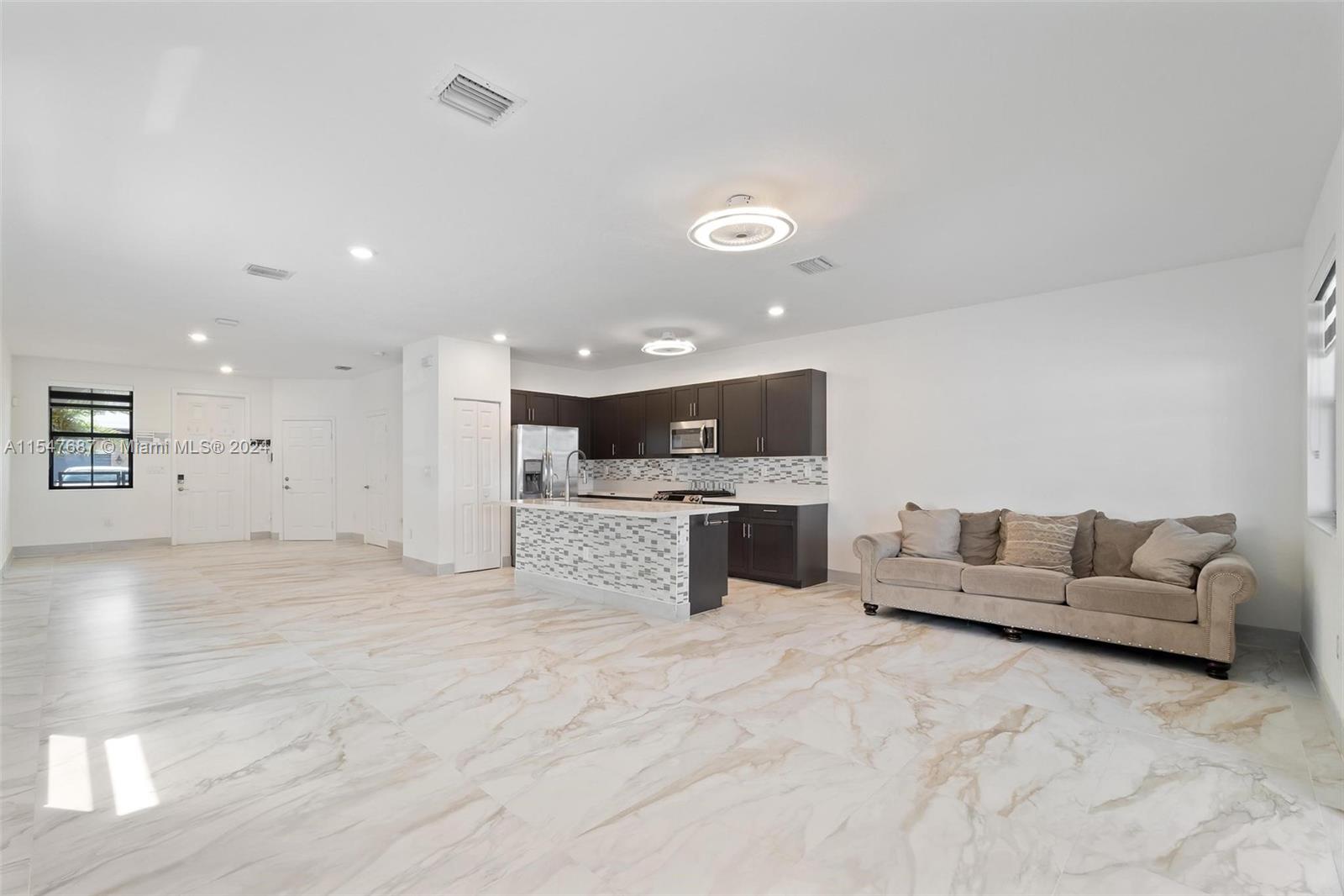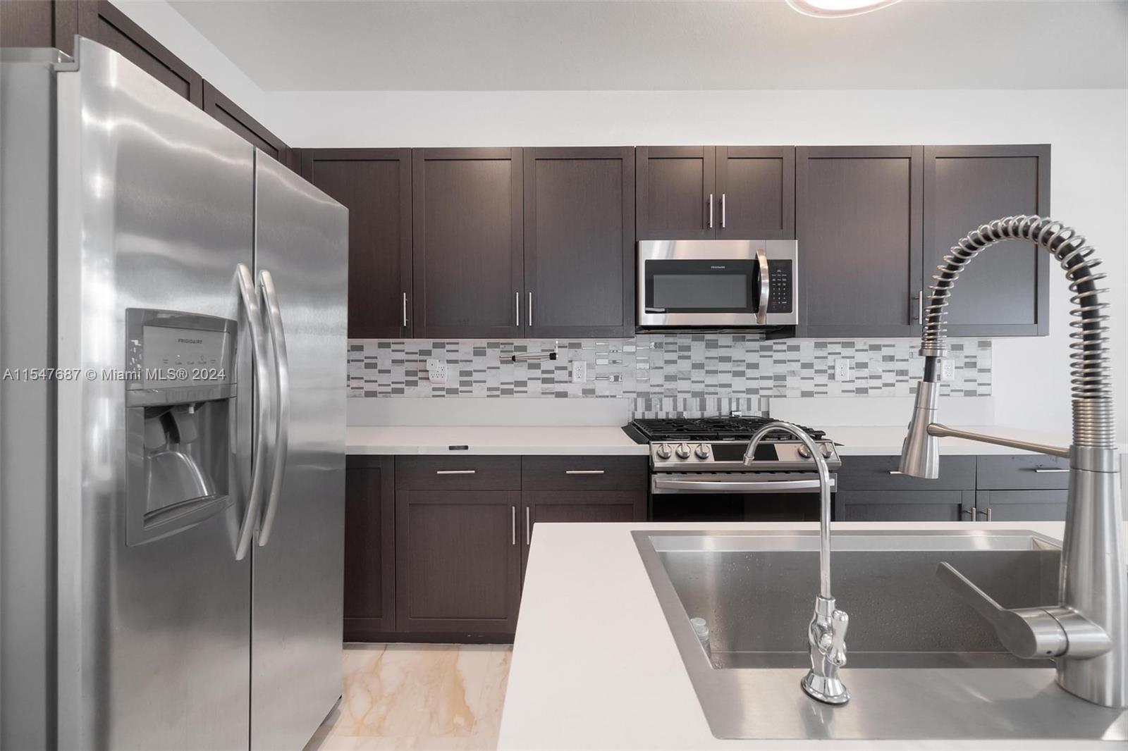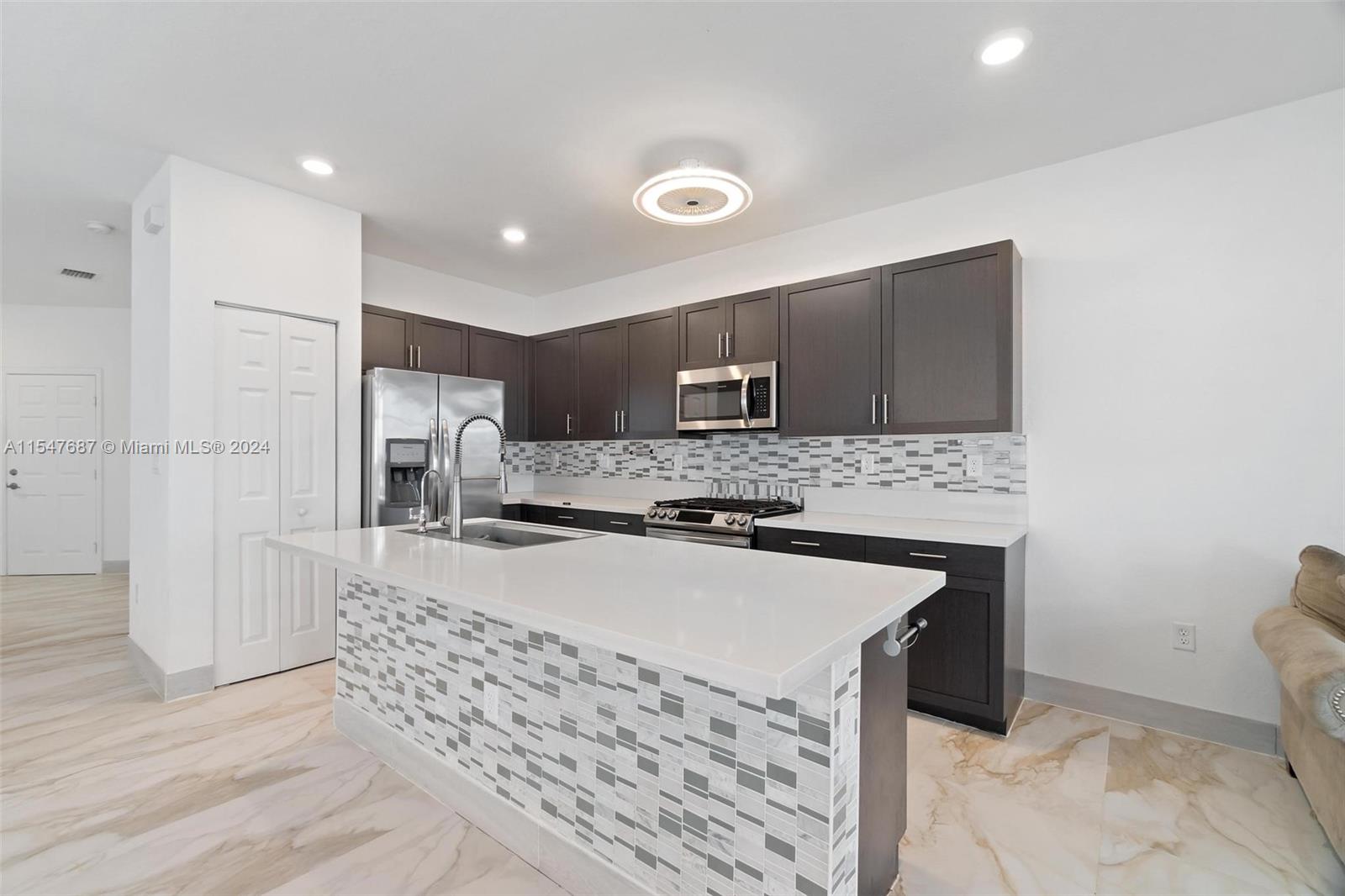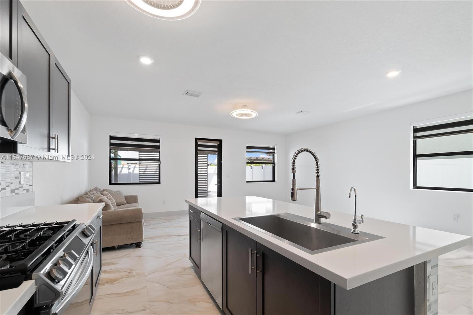Spectacular single family home with 4 bedrooms and 2.5 bath located in Aquabella like new, gated community with two club house, pool, Kids Pool, Gym…Completely remodeled porcelain, vinyl, wood and marble floors in the back patio, quartz counter top, modern sink , gas stove, mosaic tile in backsplash and kitchen island and water filter, modern blinds throughout the house, large LG washer and dryer, lighting around the house, solar lamp lighting in the back yard, spectacular pergola with fan, connection for TV, fenced, blinds on the sides for the sun, the garage door is electric, the garage has its air conditioning, two fans, lighting, and a carpeted storage at the top, in the driveway extension to park up to 3 cars, two palm trees, don’t wait any longer and schedule your appointment